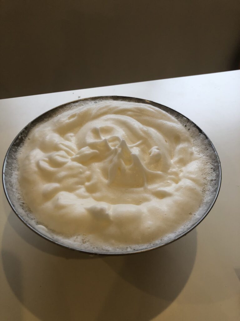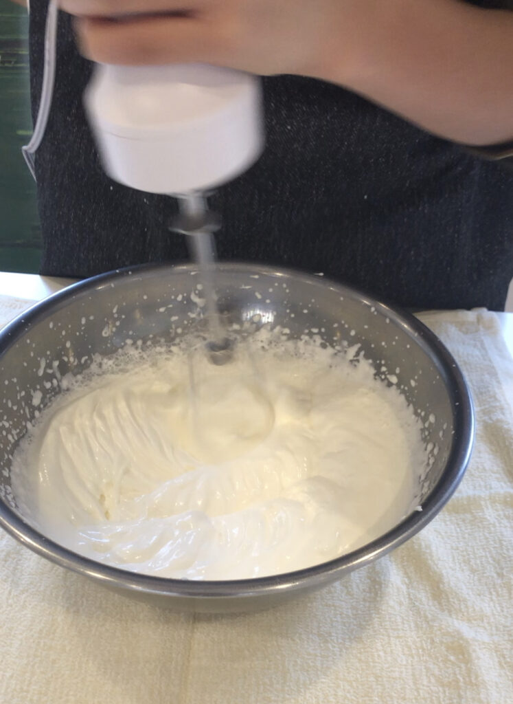 両方ともツノが立つまでしっかりとハンドミキサーで混ぜていきました。