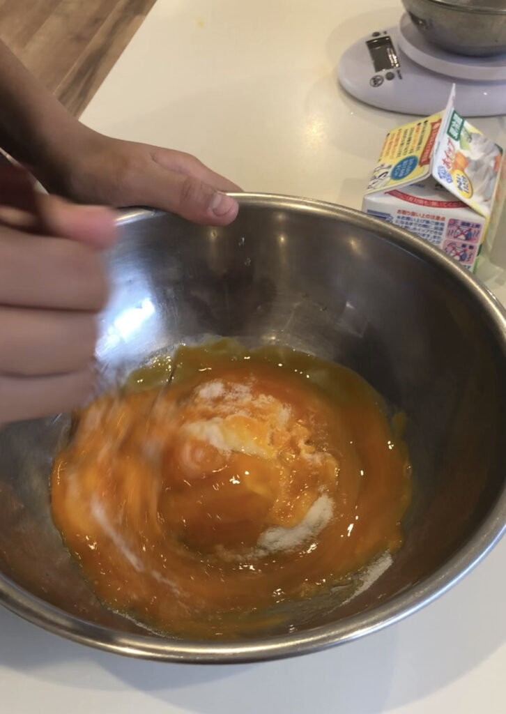 次は卵黄とグラニュー糖20gを混ぜていきます。