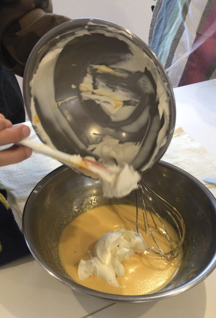次は今まで混ぜた卵黄、マスカルポーネチーズ、メレンゲのすべてを混ぜていきます。