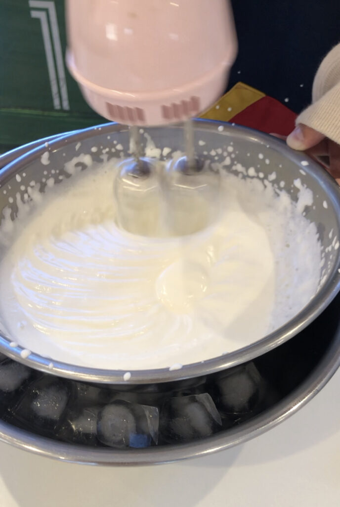 次は氷水の上で生クリームをツノが立つまで混ぜていきます。