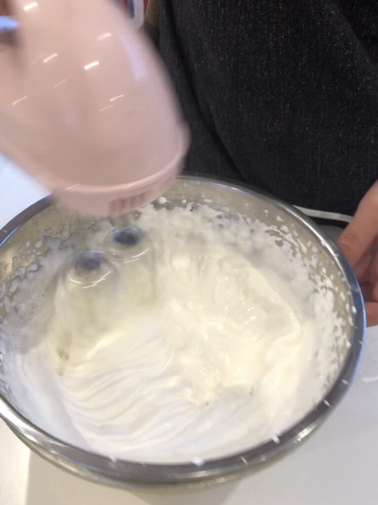 しっかりツノが立つまで生クリームをハンドミキサーで泡立てました。