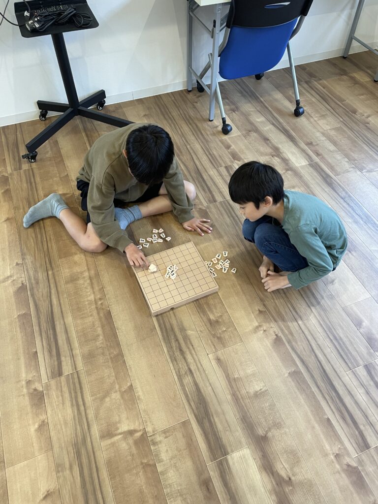 将棋盤の上に駒をランダムに山積みにして、1本の指で盤の外へいくつかの駒を滑らせていきます。