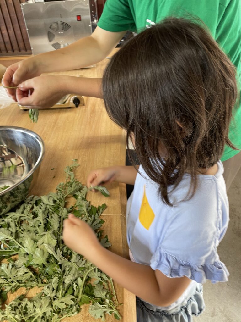 みんなすぐに中に入って摘んだよもぎを細かくちぎっていきました。