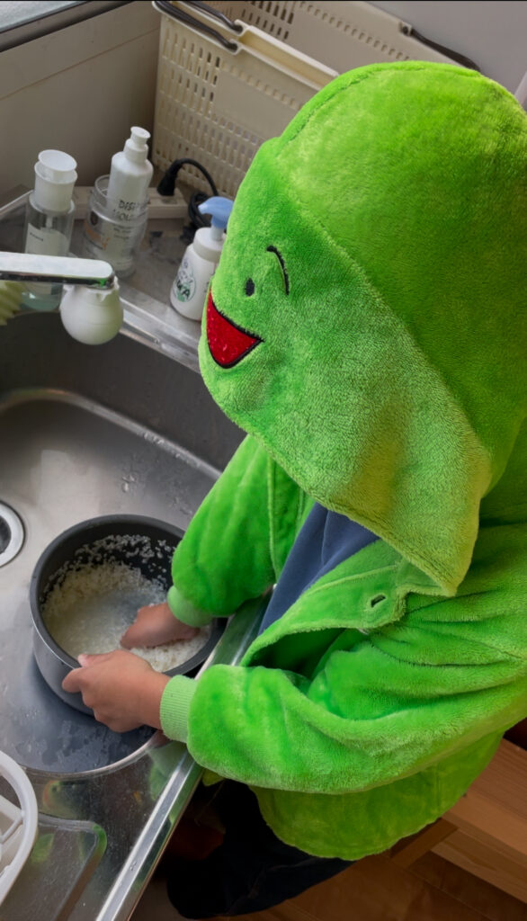 今までやったことなかったみたいでしたが、しっかり指示を聞いて、上手にお米を研いでくれました。