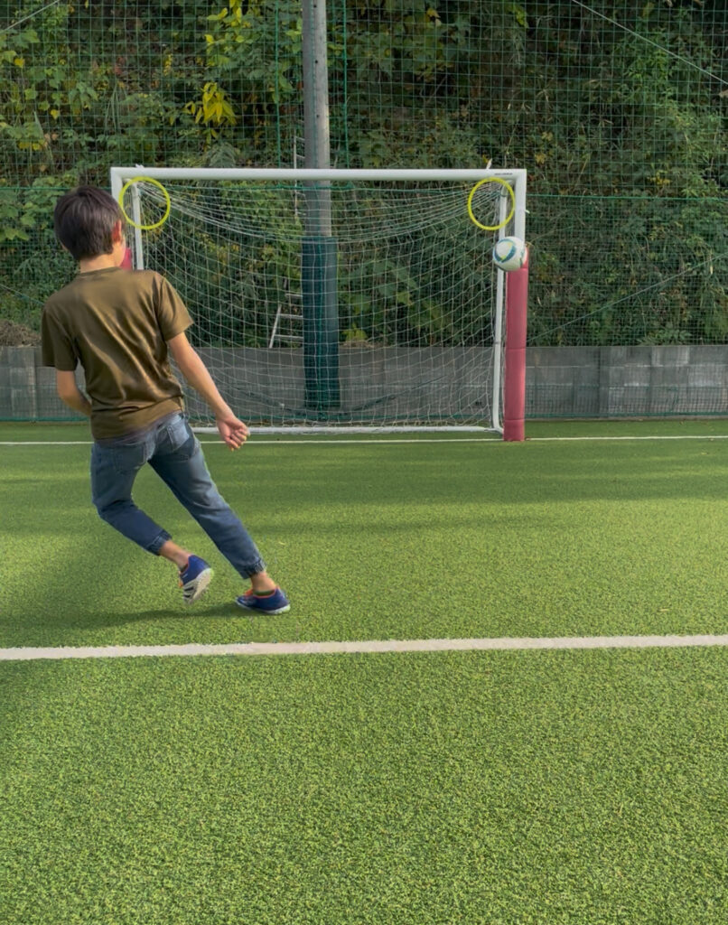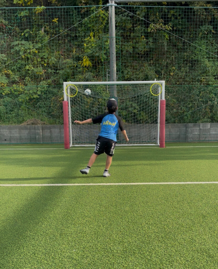 所定の位置からゴール隅に設置されたフラフープの中にボールを通すゲーム。