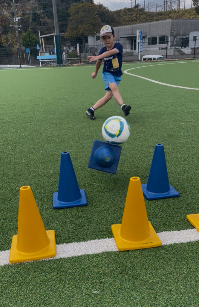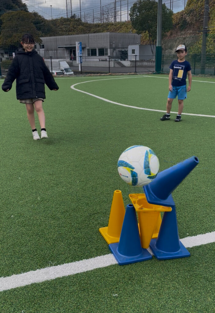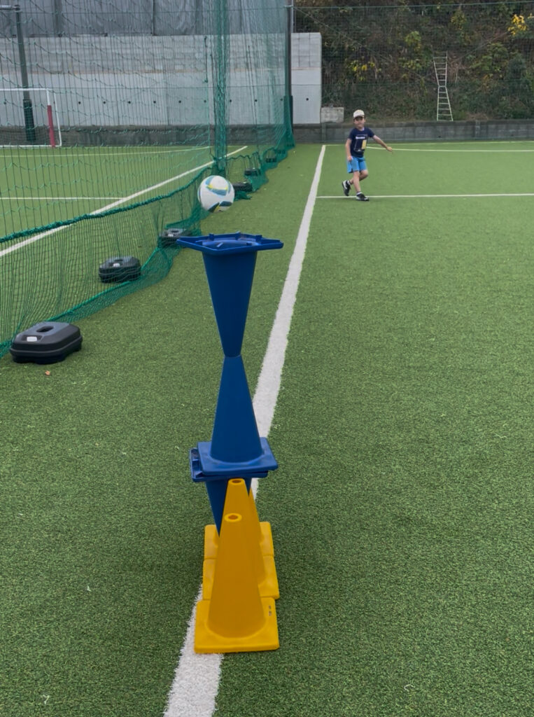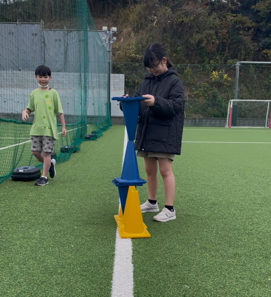 コーンを重ねて上のコーンだけ狙うという遊びに発展しました。